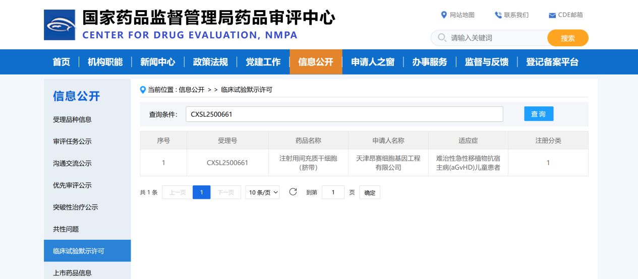 2025年11月3日, 天津昂賽細(xì)胞基因工程有限公司申報(bào)的注射用間充質(zhì)干細(xì)胞(臍帶)治療難治性急性移植物抗宿主病(aGvHD)兒童患者的適應(yīng)癥獲得國(guó)家藥品監(jiān)督管理局臨床試驗(yàn)?zāi)驹S可